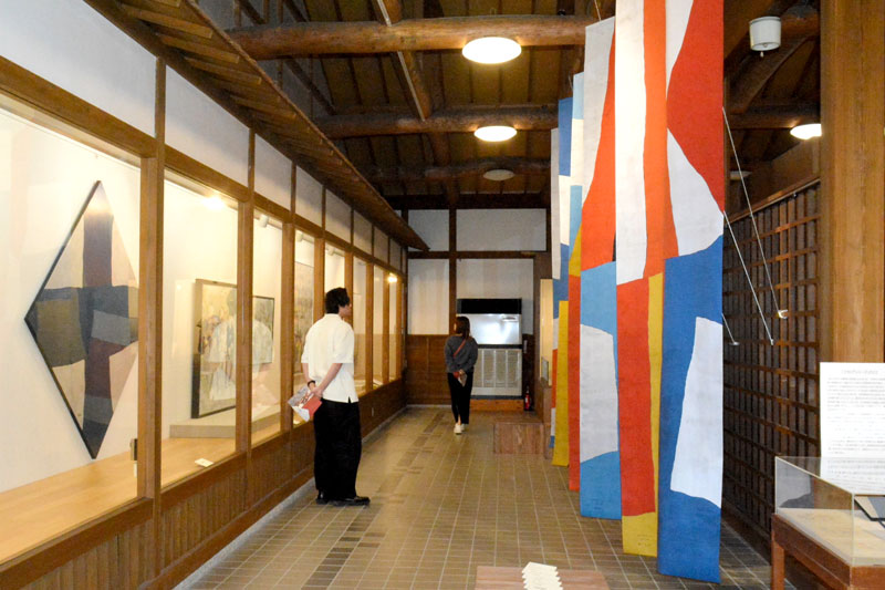 田園の美術館で開かれている特別展「旌旗蔽空」。ミズさんの色鮮やかなフラッグ5枚も紹介している=いすみ市