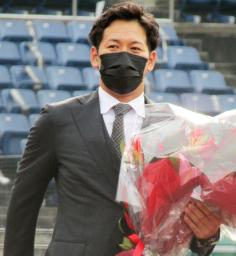 小学生の頃から親交がある荻野に花束を渡され、グラウンドでは胴上げされた。昨季まで広島で13年間プレー。今年8月にロッテに入団するまでは独立リーグの九州アジアリーグ、火の国(熊本)に所属した。「いろんな人に支えられたので、全ての人に感謝したい。この1年は僕にとって財産になった」と感慨深く話した。