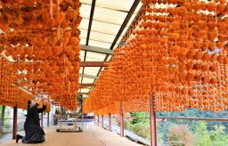 日本一の「串柿の里」として知られる和歌山県かつらぎ町の四郷地区で3日、伝統の串柿作りが最盛期を迎えた。山あいの農家の軒先にオレンジ色の柿の玉すだれが整然とつるされ、晩秋の山里を彩る。約2週間後にローラーで圧して形を平たく整え、12月中旬から主に京阪神方面へ出荷。串柿は正月に縁起物として鏡餅やダイダイと一緒に飾られる。