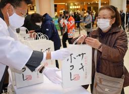 先行販売が始まった秋田県の新高級ブランド米「サキホコレ」を購入する人=6日午前、秋田市