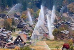 世界文化遺産に登録されている岐阜県白川村の白川郷で7日、伝統の合掌造り集落の火災に備えた恒例の放水訓練が実施された。見頃を迎えた紅葉の山々を背景に、高さ約20メートルの水柱が集落のあちこちで白く輝いた。