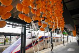 山形県上山市のJR奥羽線かみのやま温泉駅ホームに8日、初冬の風物詩「柿ののれん」がお目見えした。生産量日本一を誇る地元特産の紅柿約1100個で作製し、利用者に魅力をPRする。12月27日まで展示される。