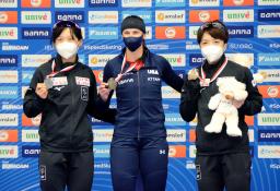 女子1000メートルで2位の高木美帆(左)と3位の小平奈緒(右)。中央は優勝したブリタニー・ボウ=トマショフマゾウィエツキ(共同)