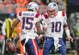 TDパスを受けた仲間と喜ぶペイトリオッツのQBジョーンズ(右)=アトランタ(USAトゥデー・ロイター=共同)