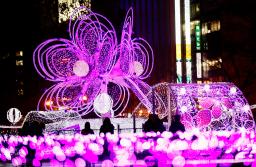 メイン会場の大通公園には、紫色のライラックの花をモチーフにした高さ約8mのオブジェなどが設置された。小雨がやんだ午後4時半、電飾が一斉に点灯すると、集まった家族連れやカップルから歓声が上がった。
